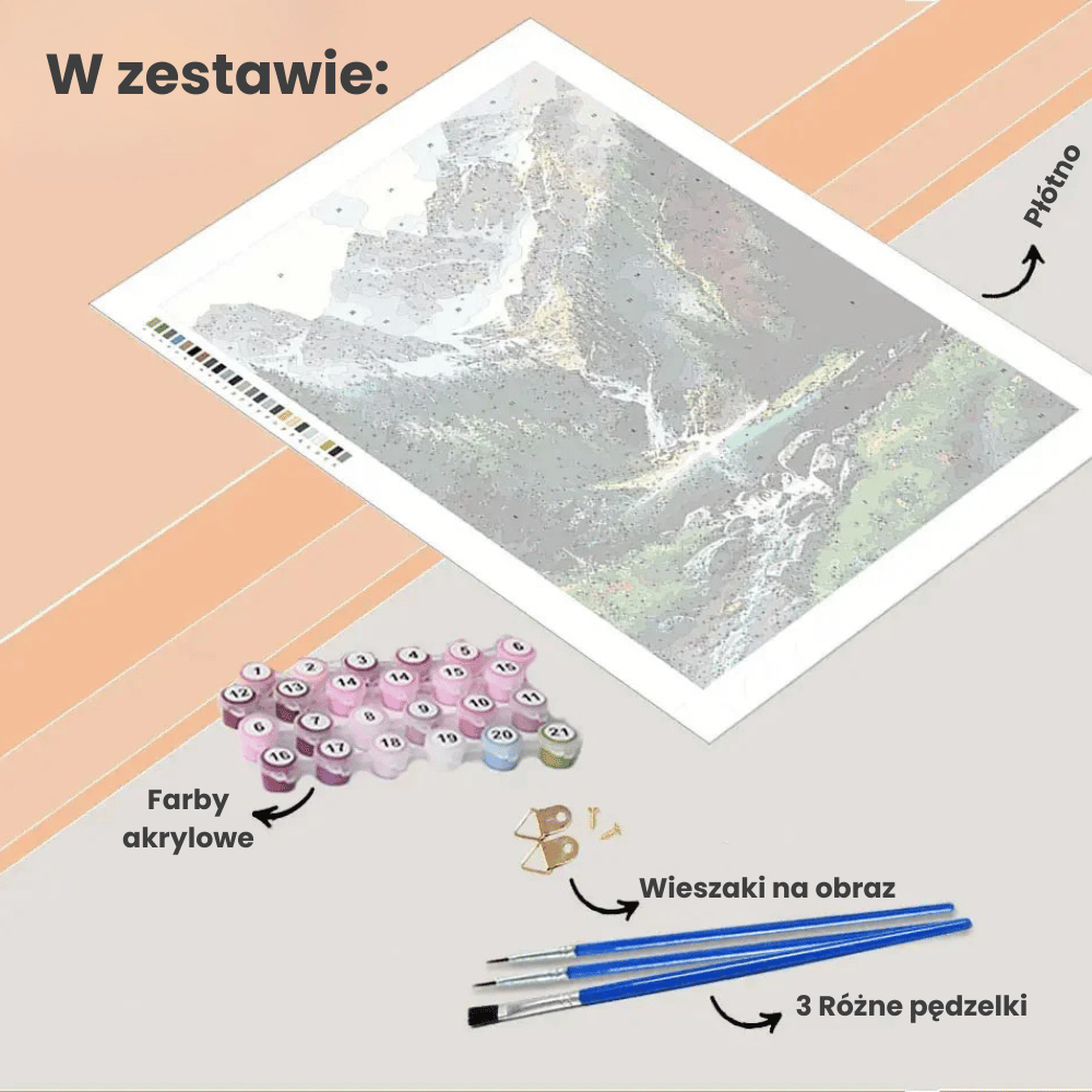 🖌️ Zestaw zawiera wszystko, czego potrzebujesz — płótno, pędzelki, farby i wieszaki