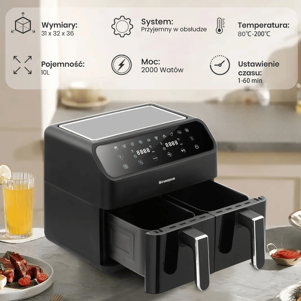 Oszczędzaj czas i miejsce w kuchni z Air Fryerem Dwukomorowym 10L – Twoim nowym sekretem zdrowego gotowania! 🍴